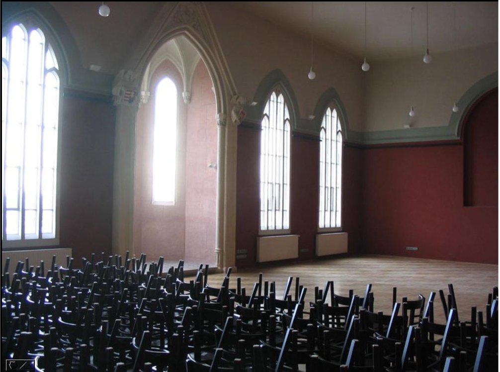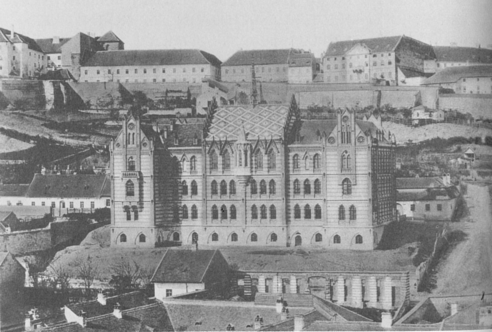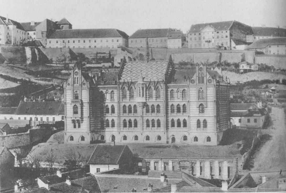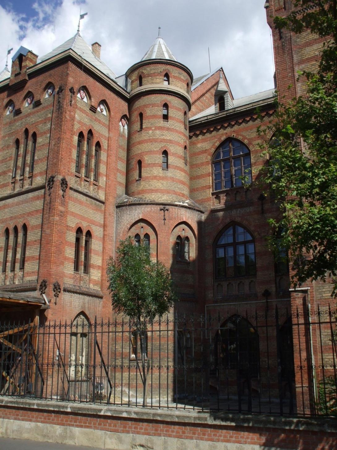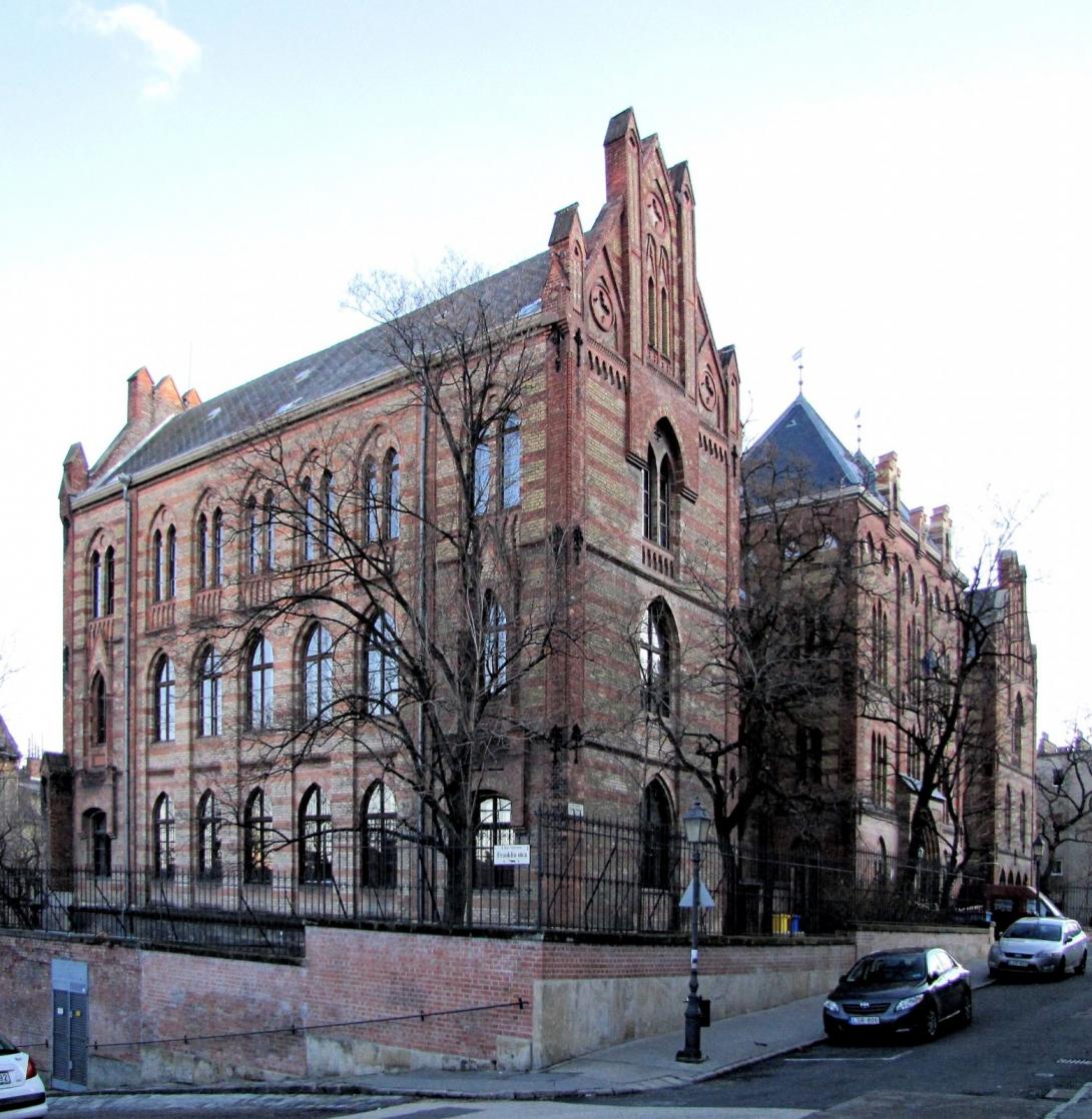 Az iskola kétemeletes neogót stílusú, sárga és vörös nyerstéglából készült épülete 1857 és 1859 között épült Petschnig János, a pesti reáliskola (a mai Eötvös József Gimnázium) rajztanárának tervei alapján a Donáti utca és a Neue Gasse (a mai Toldy Ferenc utca) között.