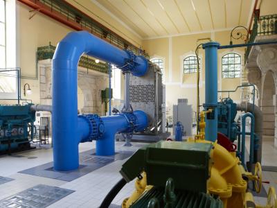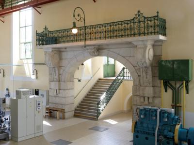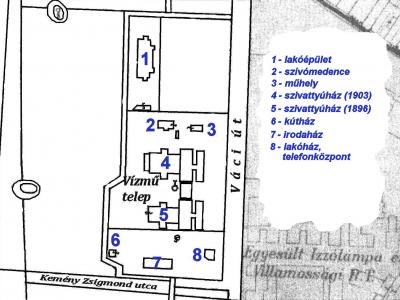 A főtelep fennmaradt műemléki értékű épületei a két, T-alaprajzú szivattyúház, az irodaépület, egy nagyobb és egy kisebb lakóház, a befogadó szívómedence, a műhely és egy kútház. Az épületek általános jellemzője a lábazaton, a nyíláskeretezéseken, a sarkokon és a lizénákon lévő vakolat- vagy tégla-architektura, a nyeregtető, a törtvonalú, íves-volutás oromfal-lezárás.