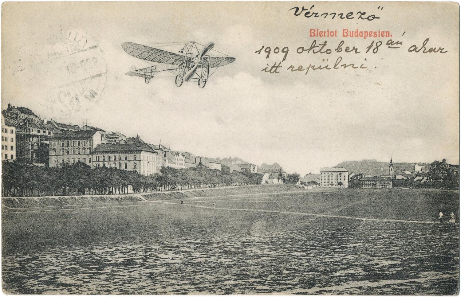 Blériot budapesti repülése alkalmából több képeslap is megjelent (rákopírozott repülővel). Az itt közölt Vérmező mellett a Duna felett is ábrázolták. Végül a repülésekre három  (egyenként 6-8 perces időtartamú) felszállással került sor 1909 október 17-én. Színhelye az Üllői út melletti gyalogsági gyakorlótér volt (a mai Üllői út, az Ecseri út, az Epreserdő, Csengettyű és Pöttyös utcák közöti terület). Innen az aviatikus – a szélviszonyok függvényében – 20-70 méteres magasságban egy-egy kört tett, kb. a Határ útig terjedően. A nézőközönség létszáma kb. 250-300 ezer volt, ami az akkori Budapest lakosságának egyharmadát tette ki.