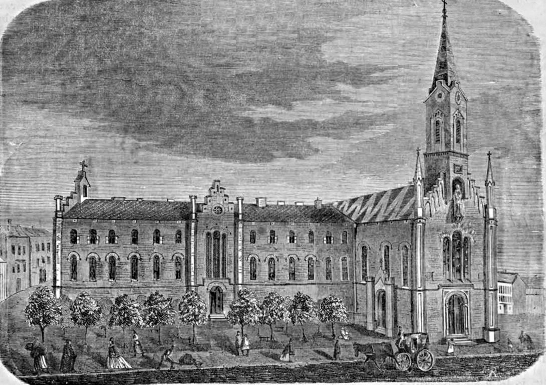 Az újjáépítést (amelynek során az épület elnyerte mai formáját) 1854-56-ban az Országos Építési Igazgatóság hajtotta végre, a Reitter Ferenc vezetésével és Glaser Rudolf, Szumrák Emil közreműködésével készített terv alapján. A kivitelezést Gerster Károly,majd Becker Károly végezte. Elsőként a kolostort építették át, főfalait megtartva, keleti homlokzatát egy teljes teremsorral növelték. A hosszú épület középtengelyében emeletes könyvtártermet alakítottak ki, és a temploméhoz hasonló lépcsőzetes oromzattal látták el. Az épület déli oldalához új szárnyépületet húztak fel iskola céljára. A templom barokk homlokzatát kissé hátrahúzták, és a kapucinus hagyománytól eltérően hegyes toronnyal látták el, tekintettel az épület plébániatemplomi rendeltetésére. A három oldalról szabadon álló egyhajós, egyenesen záródó szentélyű, középtornyos, romantikus historizáló stílusú templomhoz délről a kétemeletes, zárt udvarú, azonos stílusban épült zárdaépület csatlakozik, melyet a templom homlokzatával megegyező stílusú középrizalit emel ki. A templom egyik főbejárata a keleti, a másik a déli oldalon nyílik.