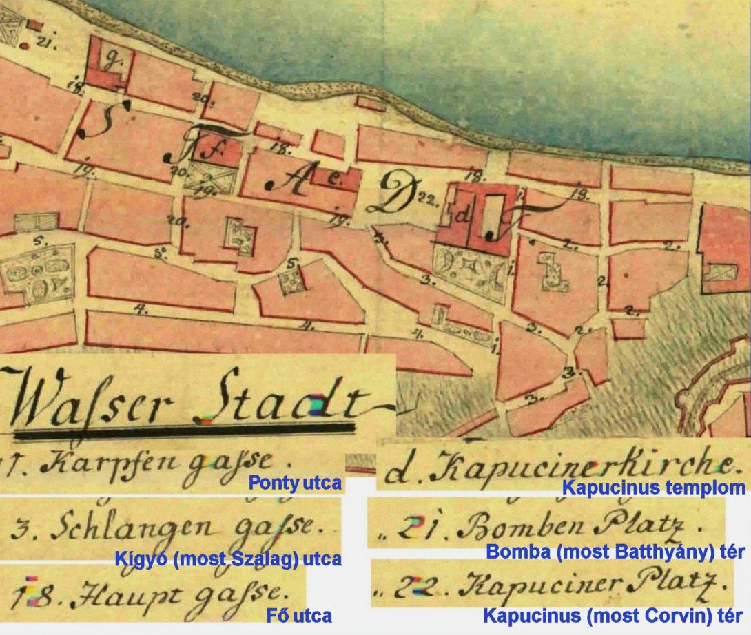 A Kapucinus templom helyén feltételezünk egy középkori ágostonrendi kolostort. Köveiből építhették Buda 1541-es török elfoglalásától Tojgun pasa dzsámiját és egy török fürdőt. Buda 1686-os felszabadítását követően a jezsuiták a dzsámit plébániatemplommá, a fürdőt katonai kórházzá alakították. Az 1688-tól a kapucinusokhoz került templomot, több szakaszos bővítését követően, Árpád-házi Szent Erzsébet tiszteletére 1716-ban szentelték fel. Az 1760-as években újabb átalakítással - melynek mestere a Budán több helyen munkát vállaló Nöpauer Máté - volutás oromzatú, barokk homlokzatot kapott a kelet felé meghosszabbított templom. A mai Corvin tér helyén állt, bekerített kolostort is átépítették. 1849-ben a budai vár ostroma során a klasszicista Duna-sort szétlövető Hentzi ágyúi a kapucinus-épületeket is súlyosan megrongálták.