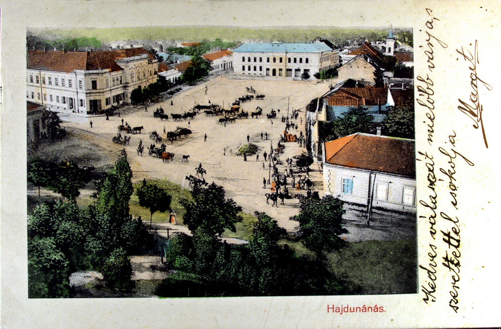 Hajdúnánás főtere a templomtoronyból 1900 körül. A hetipiacokat is itt tarthatták. Középen felül a járásbíróság épülete, mely napjainkban középiskolai kollégium. Bal oldalon a városháza saroképülete. A jobb felső sarokban a római katólikus templom tornya magasodik. A kép valószínűleg fotó alapján készült, kézi szinezéssel.