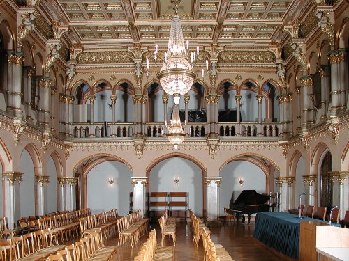 Az épületnek talán legszebb része a díszterem, amely galériás, karzatos megoldású. A falak mentén oszlopok helyezkednek el, szürkés márvány borítással, neoromán kifestéssel. Mennyezete stukkós festett kazetta rendszerű. A faragott tölgyfa ajtók, valamint a festett üvegablakok harmonikusan kiegészítik a díszterem belső kiképzésének összhatását. A megvilágítást három, mennyezetről lógó csillár biztosítja.