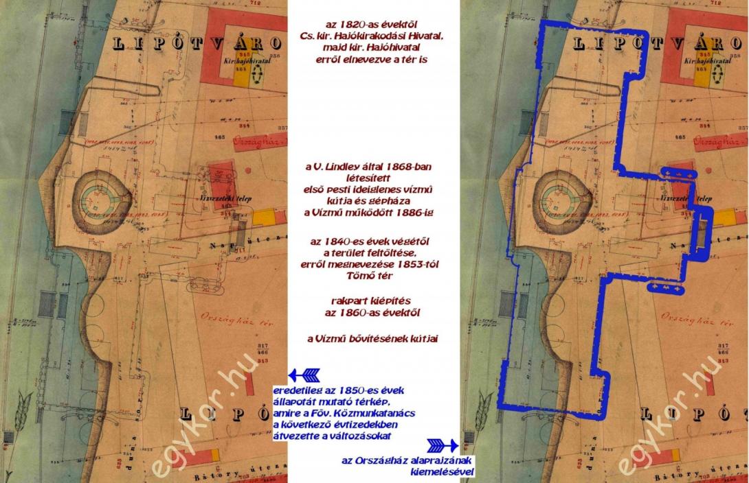 Az Országház helyéül az akkori leírás szerint "a malmokkal, kaszárnyákkal, roskadozó épületekkel környékezett, nagy reményű Tömő-teret" és a mellette lévő Hajóhivatal teret választották, ahol az 1868-ban létesített első, ideiglenes pesti vízmű is működött. (1880-tól Tömő, 1898-tól Országház, 1927-től Kossuth Lajos tér.) A Duna közelségének előnye az épületnek a budai oldalról majd adódó impozáns látképében, valamint a hatalmas mennyiségű építési anyag könnyű szállíthatóságában, hátránya a laza, korábban feltöltött parti talajban volt. Ez utóbbi megszilárdításához hatvanezer köbméter, 2-5 méter vastag betont készítettek egy darabban, az alapok fektetéséhez.