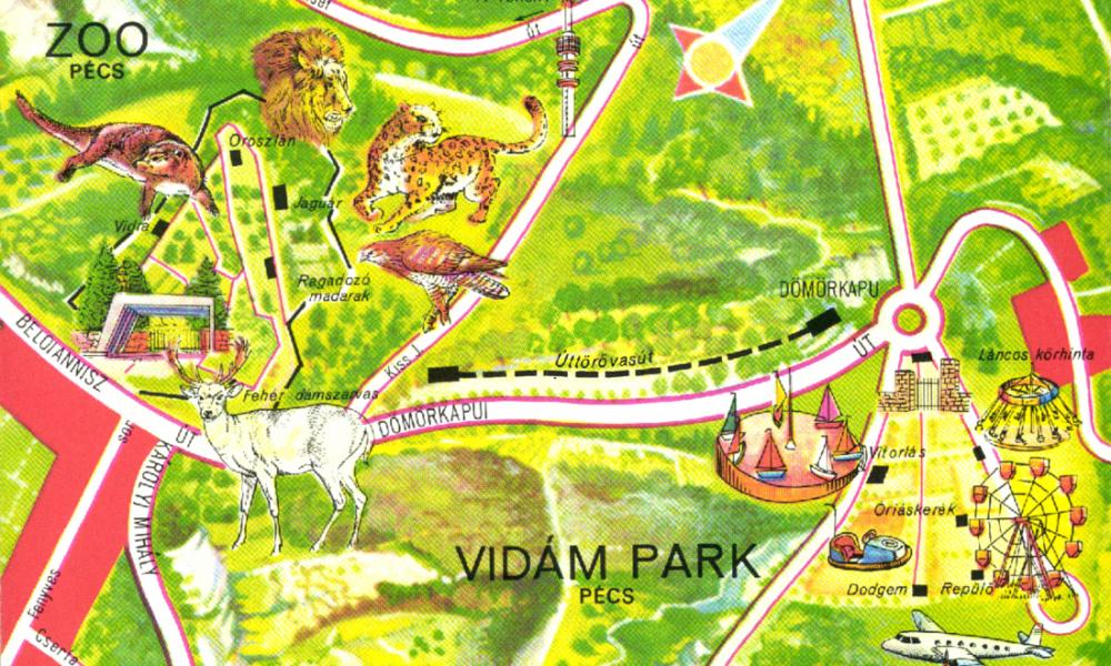 A Pécsi Vidámpark az "Egy napot Pécsért" mozgalom keretében, társadalmi munkában mintegy 600 városlakó segítségével épült fel. 1961 óta működik. A pénztárépületben tábla hirdeti: "Építették Pécs város dolgozói 76 679 társadalmi munkaórában 1961. évben. "Így a parkban egyszerre vannak jelen barkácsolási technikák és szakszerű ipari megoldások.1966-ban szabadtéri színpadot építettek, felléptek beat- és tánczenekarok, a Bóbita Bábszínház, a Pécsi Színház és országos néptánctalálkozókat is rendeztek. A kezdeti lelkesedés és a több százezres látogatószám elmúltával, minthogy a szükséges fejlesztések elmaradtak, a vidámparkban "megállt az idő". A 8-10 holdas területű park 50-féle játékkal - hullámvasúttal, óriáskerékkel, az 1965-ben épült "elvarázsolt kastéllyal" - várja vendégeit. F: pecs.hu